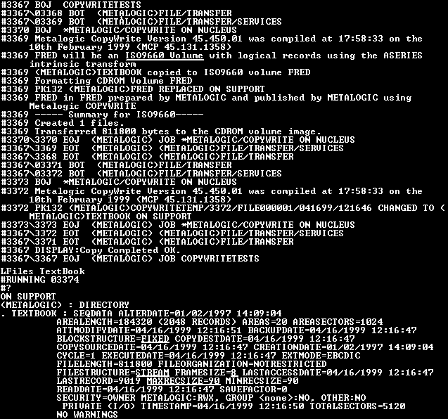 *SYMBOL/EDITOR/TEXTBOOK AS TEXTBOOK TO #MYTESTVOLUME(CD,HOSTNAME=LOCAL, SCRATCHPOOL=ASERIES)[T]; IF (T(TASKVALUE)=0) THEN BEGIN T(STATUS=NEVERUSED); COPY TEXTBOOK FROM #MYTESTVOLUME(CD,LOCKEDFILE,SCRATCHPOOL=ISO9660, HOSTNAME=LOCAL)[T]; END; |